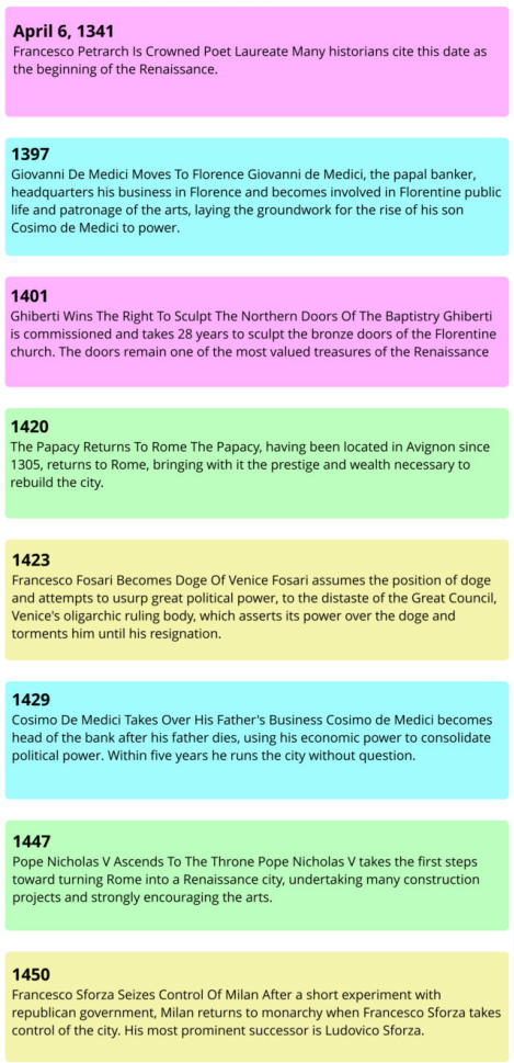 Handout of Renaissance Timeline to assist untangling the Politics, Church issues, Medici and the Arts.